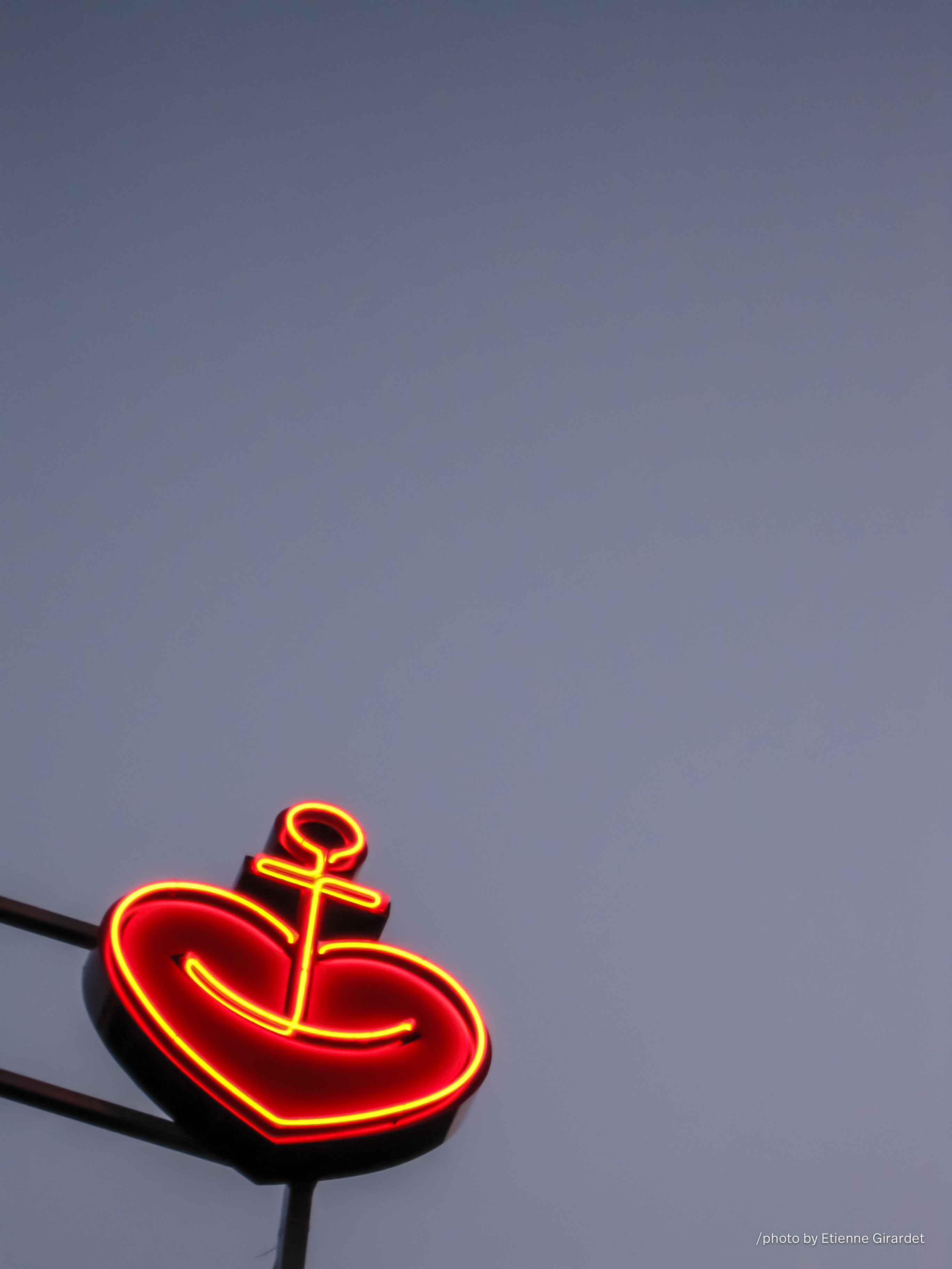 red neon heart with anchor symbol. A red neon sign, shaped like a heart with an anchor, is mounted on a building in Berlin, Germany. [updated: 02.03.2025 / CC BY-SA]