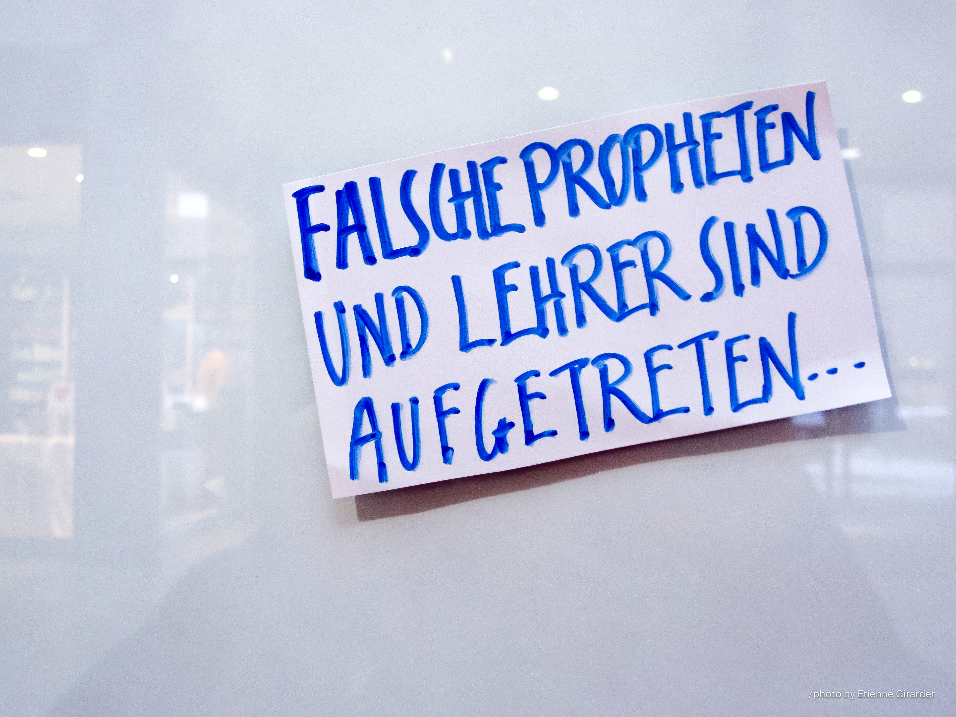 false prophets and teachers have appeared. A handwritten sign in German is displayed in Berlin, Germany. The sign reads »False prophets and teachers have appeared...".