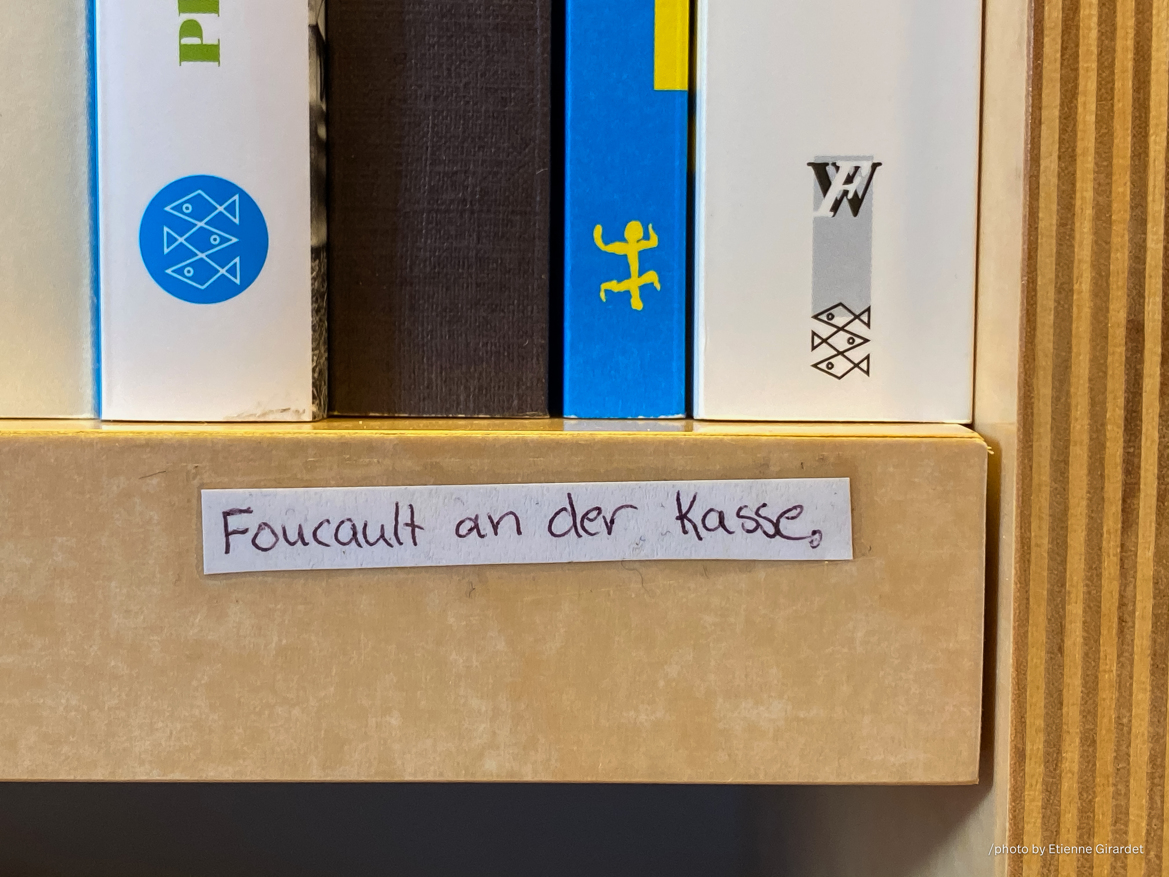 foucault an der kasse label on shelf. A handwritten note reading »Foucault an der Kasse« (Foucault at the checkout) is placed on a shelf below books in Berlin, Germany.