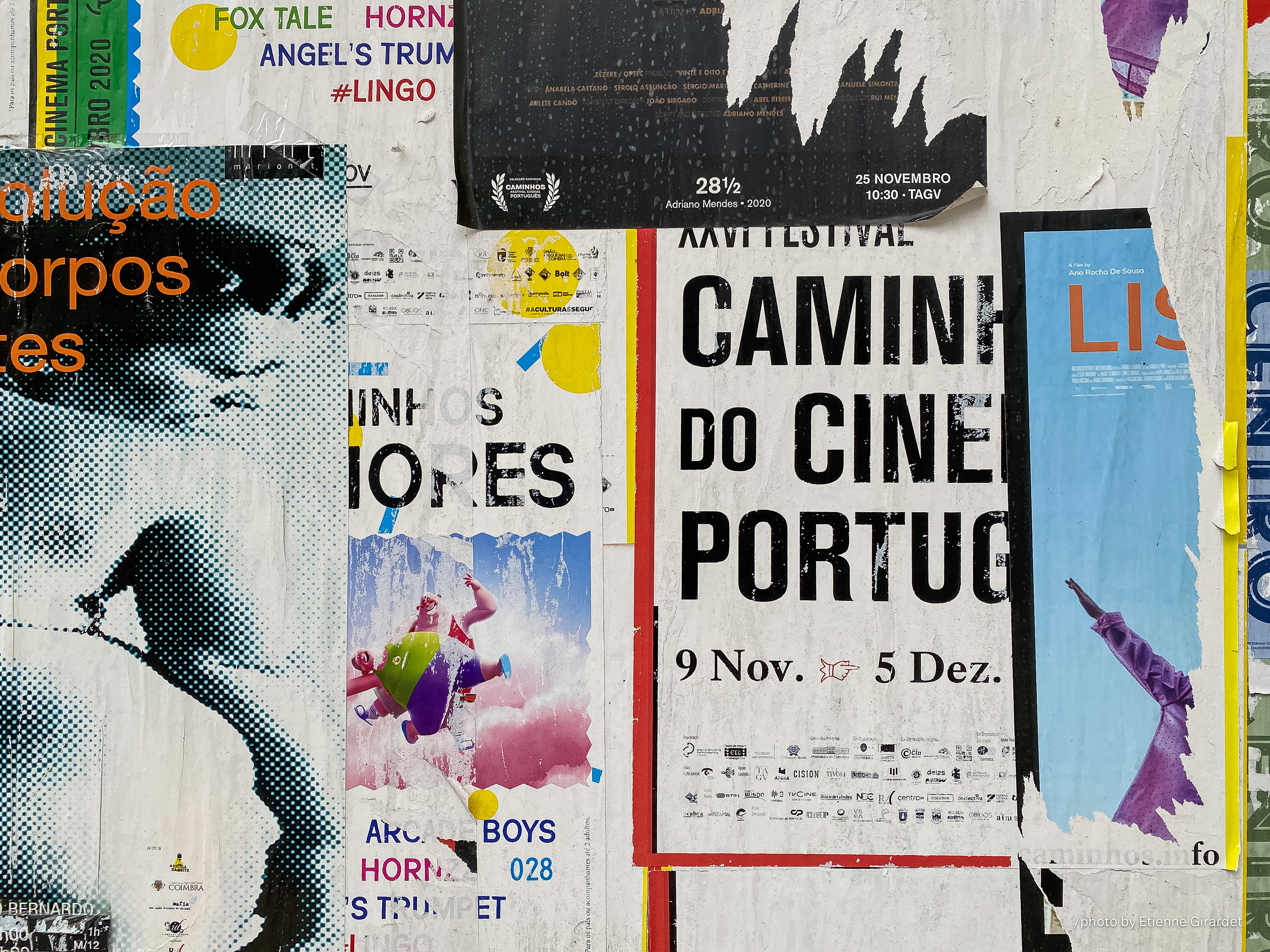 film festival posters in portuguese. A wall in Coimbra, Portugal, is covered with multiple movie posters and promotional materials. The posters advertise various films, festivals, and events, including a film festival ("Caminhos do Cine"). Dates and times are included on some posters. Several logos and branding elements are also visible. [updated: 01.06.2025 / CC BY-SA]
