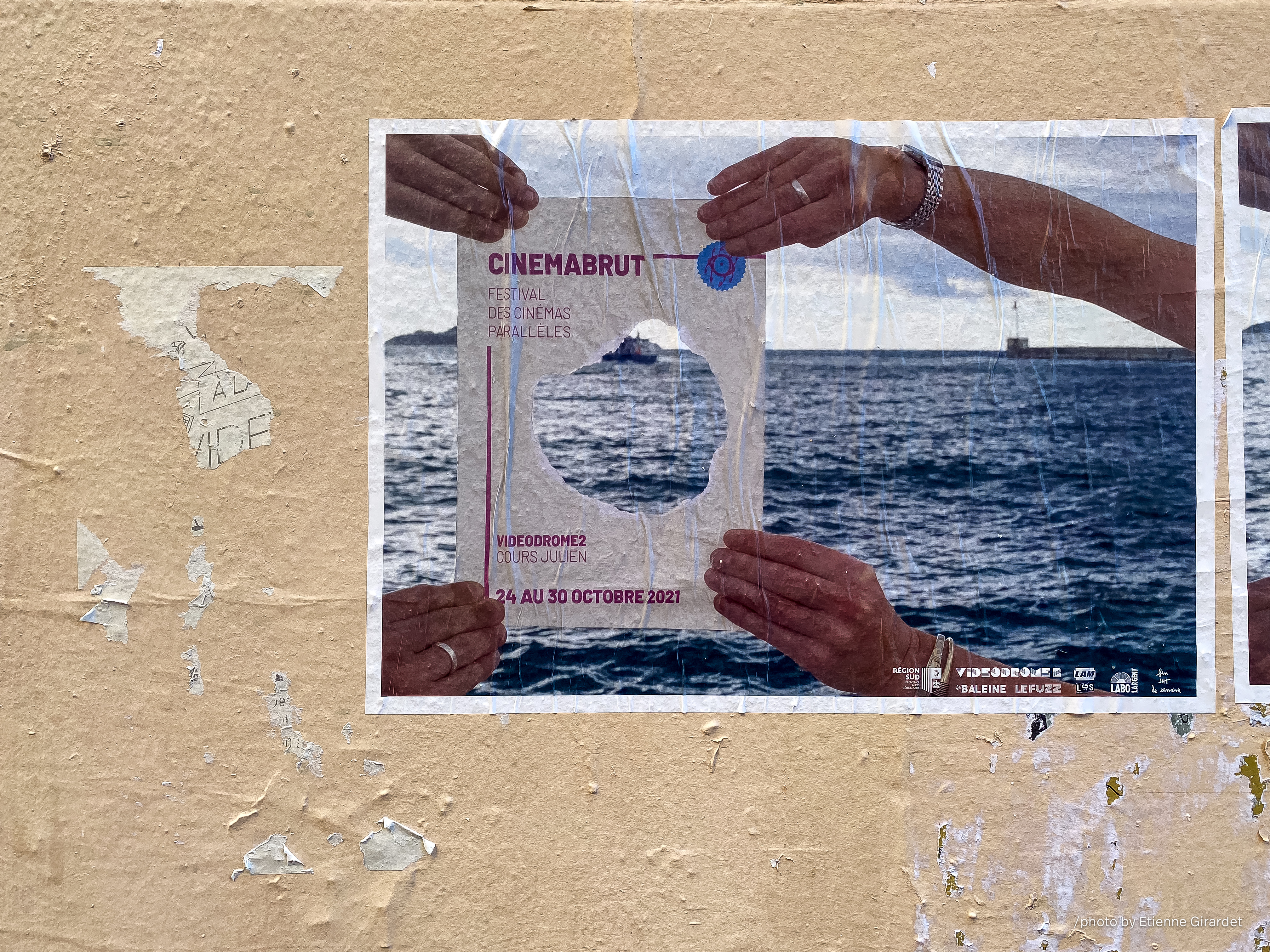 cinema festival poster october 2021. A poster advertising the »Cinemarut Festival des Cinémas Paralleles« and »Videodrome2« event, featuring hands holding a section of the poster, is affixed to a light beige wall in Marseille, France. The poster dates the event to October 24-30, 2021. [updated: 03.03.2025 / CC BY-SA]