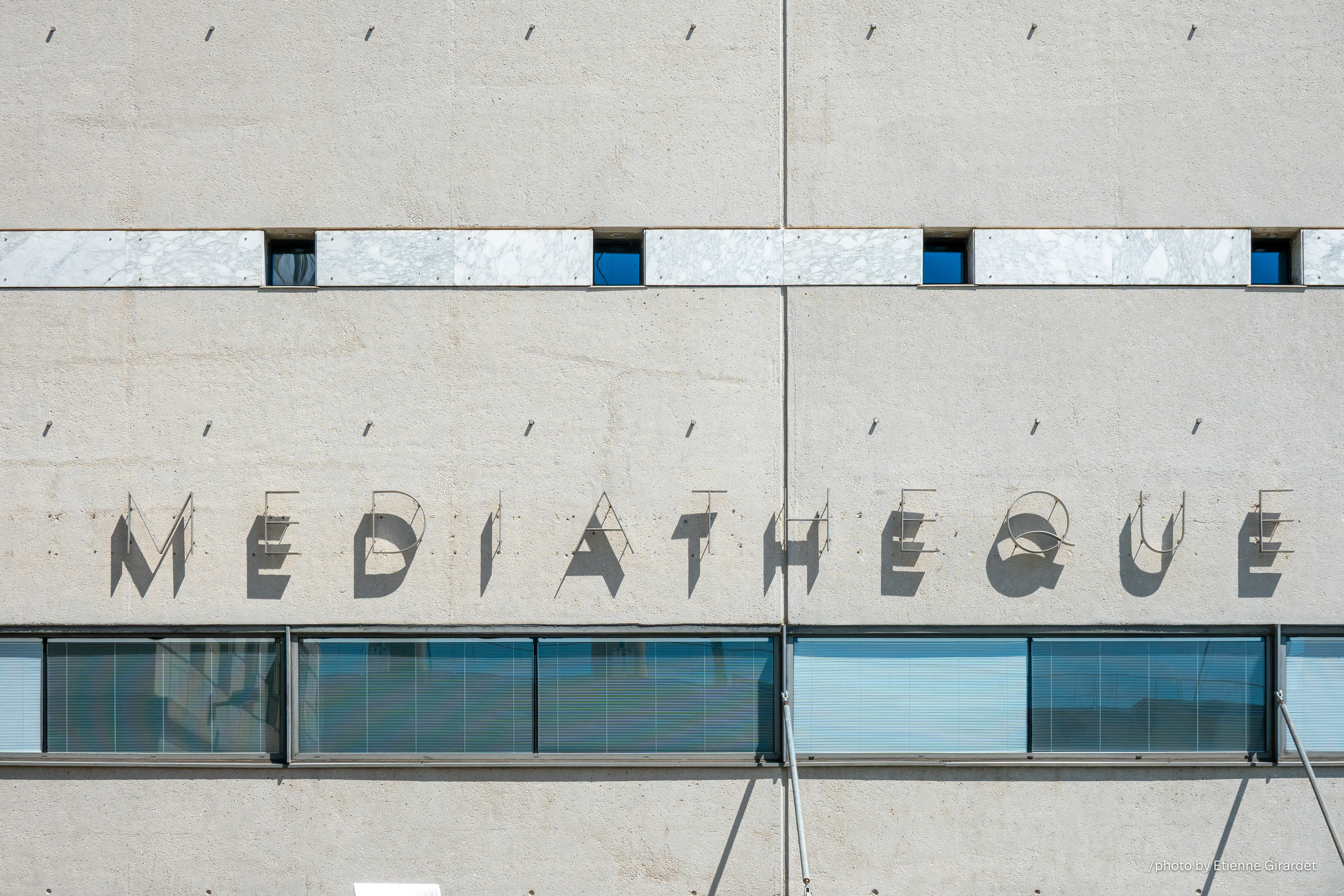 metall letters »mediatheque« on concrete wall above windows with hard shadows on a sunny summer day in montpellier, france. [updated: 17.02.2025 / CC BY-SA]