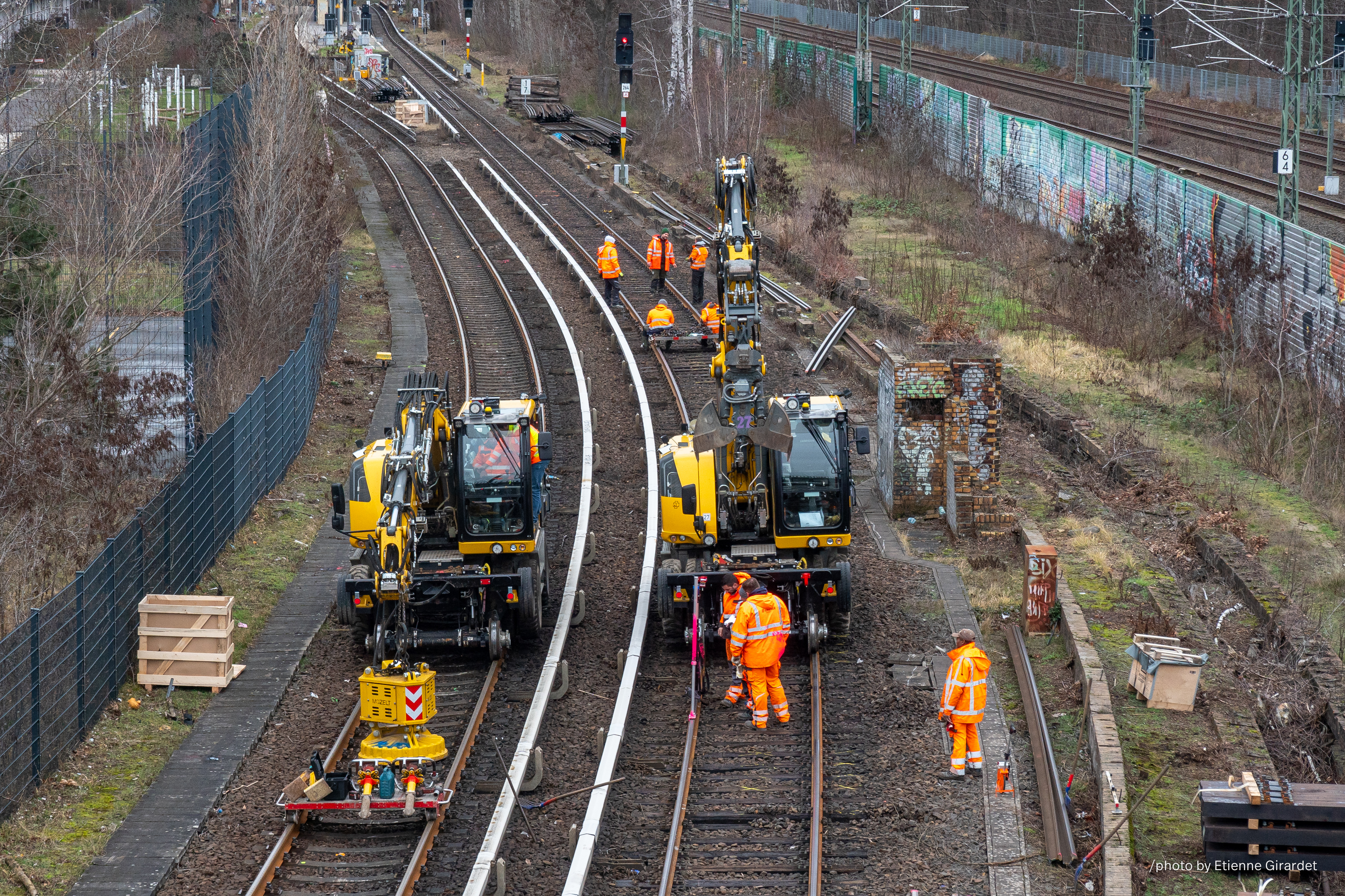 railroad track maintenance workers. Railway maintenance is taking place. Several workers in bright orange safety vests are assisting with the operation of specialized yellow machinery used for railway track work. The work appears to involve the replacement or repair of sections of railway track. [updated: 02.03.2025 / CC BY-SA]