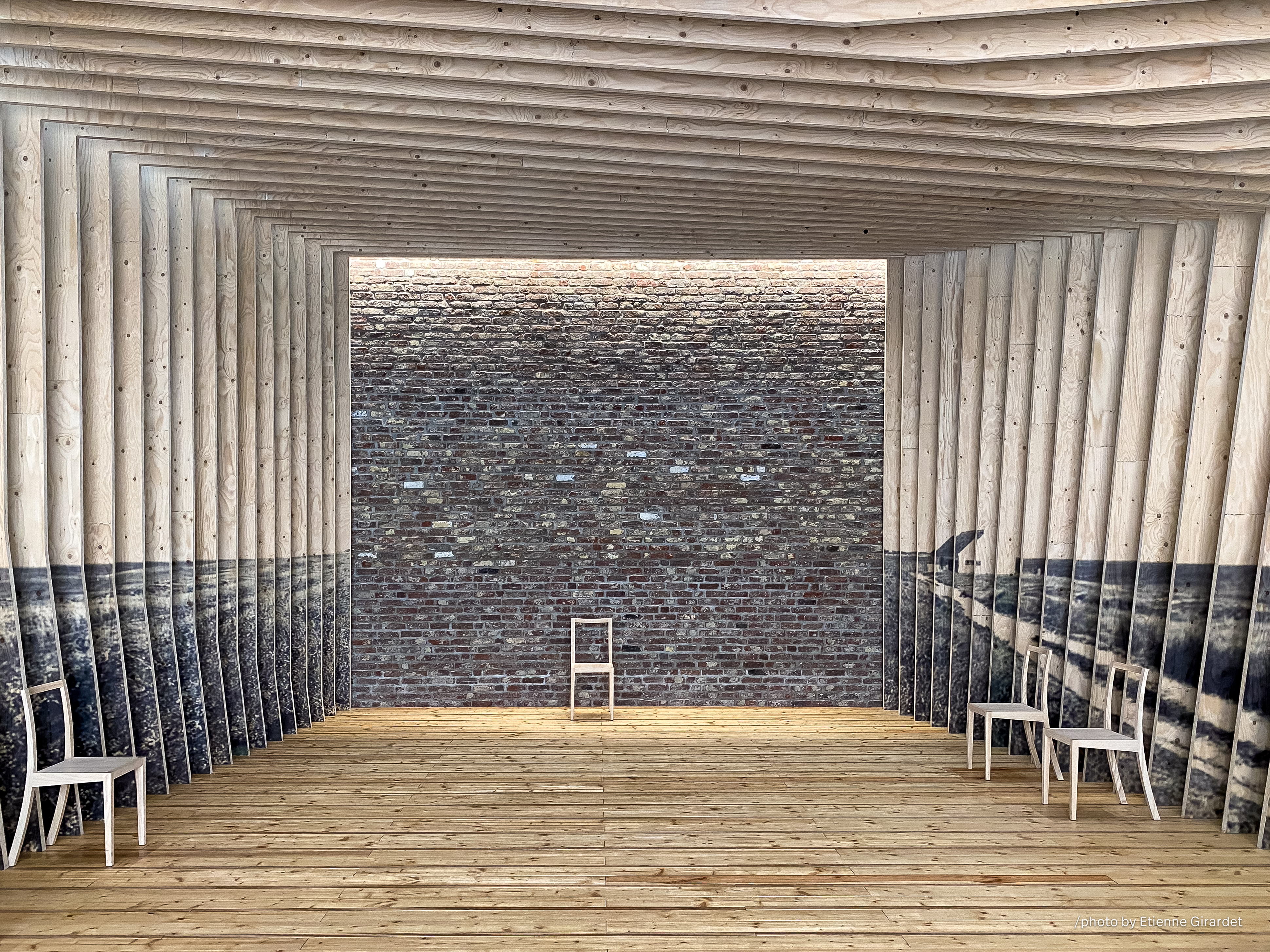 wooden interior with brick wall and chairs. Interior view of a space in Berlin, Germany. The space features a wooden, slatted wall structure with printed images on the panels. A brick wall is visible in the center of the room. Several light-colored wooden chairs are placed on a light-colored wooden floor. [updated: 02.03.2025 / CC BY-SA]