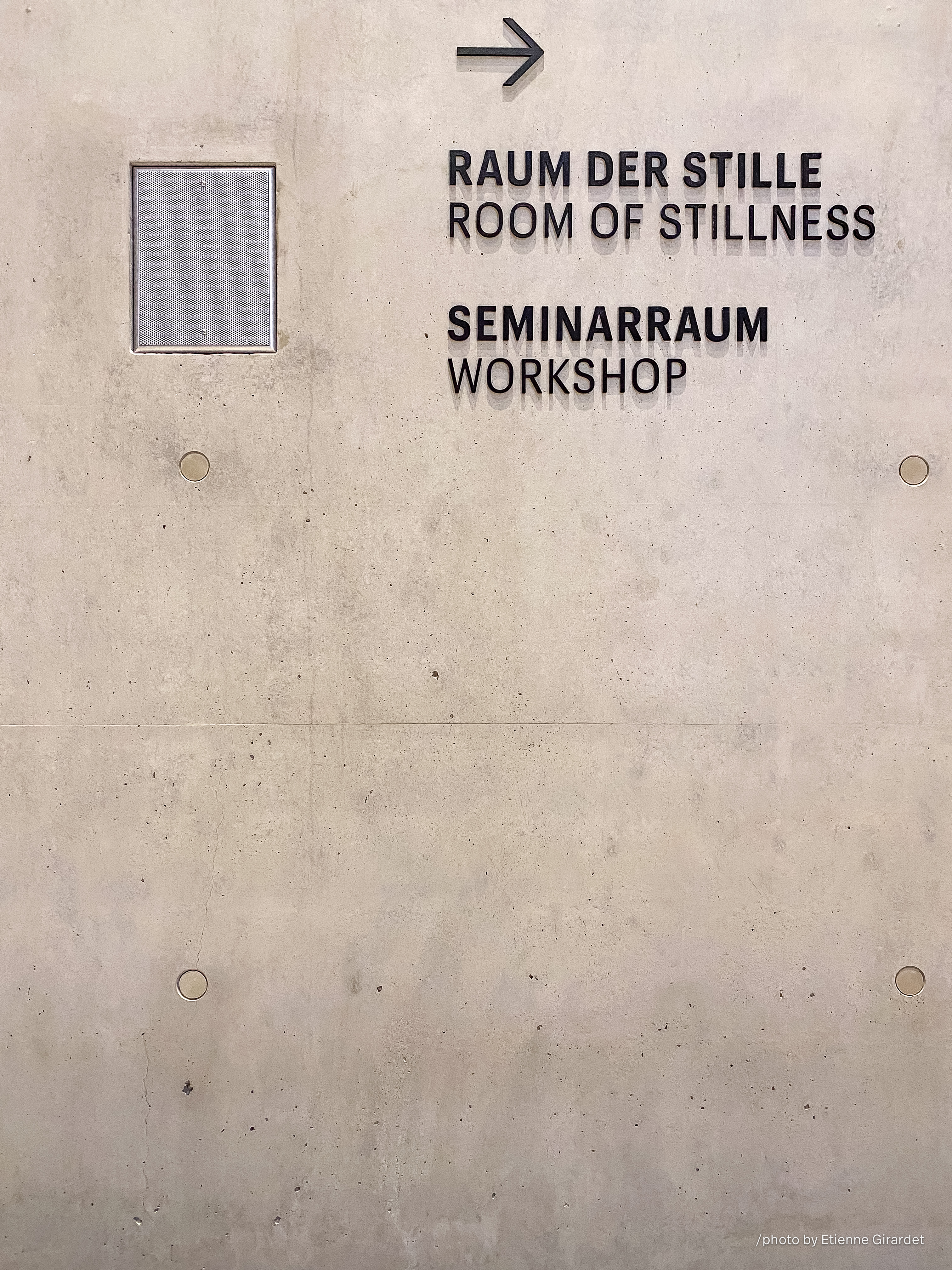 room of stillness, seminar workshop signs. A light beige concrete wall in Berlin, Germany, displays directional signage. The signs indicate a »Room of Stillness« and a »Workshop/Seminar Room". [updated: 02.03.2025 / CC BY-SA]