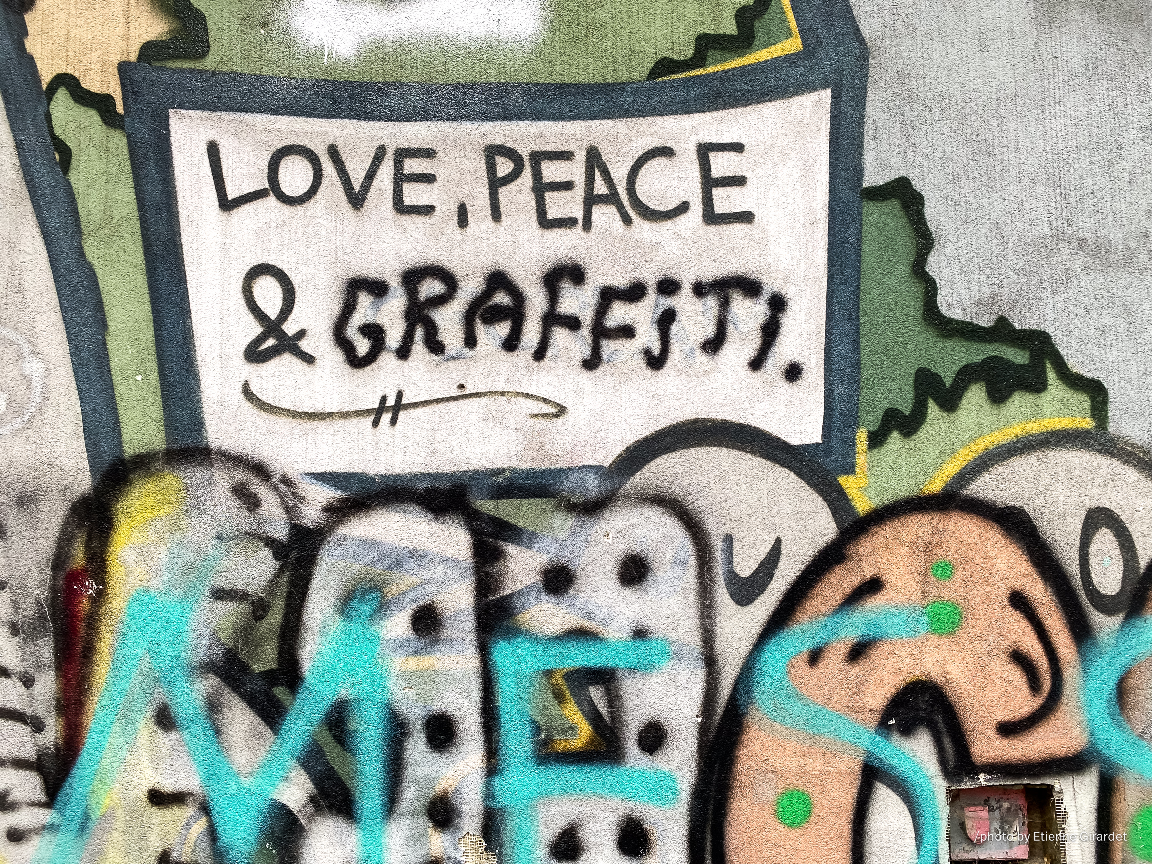 graffiti wall love peace and art. Graffiti depicting the words »LOVE, PEACE & GRAFFITI« is painted on a wall in Berlin, Germany. Various colors and styles of graffiti are present. [updated: 02.03.2025 / CC BY-SA]