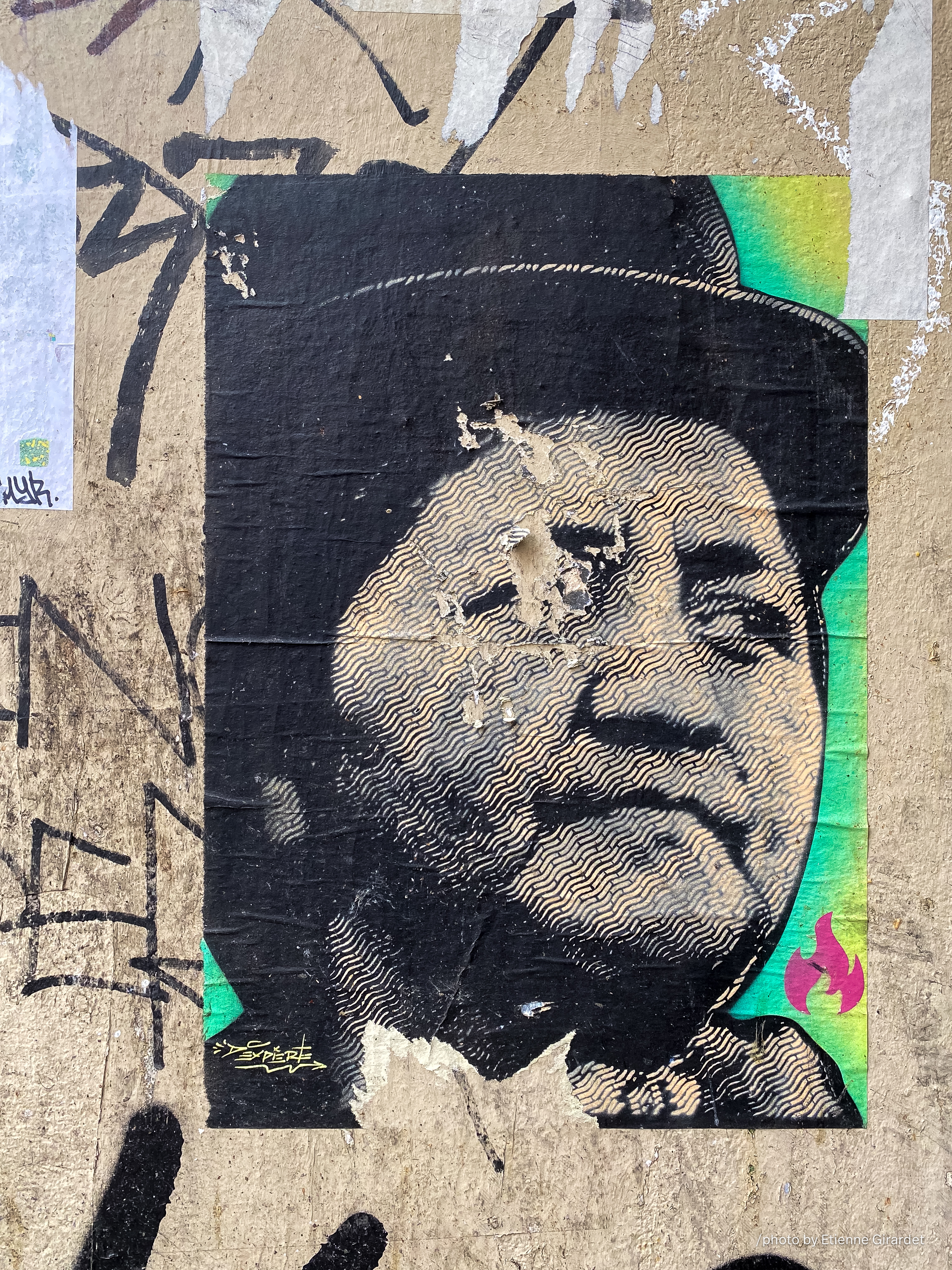street art portrait with textured face. A poster, featuring a portrait of a person with a hat, is affixed to a wall in Berlin, Germany. The poster's design uses a textured, patterned style, and includes a graphic element resembling flames. Other markings and pieces of paper are also visible on the wall. [updated: 03.03.2025 / CC BY-SA]