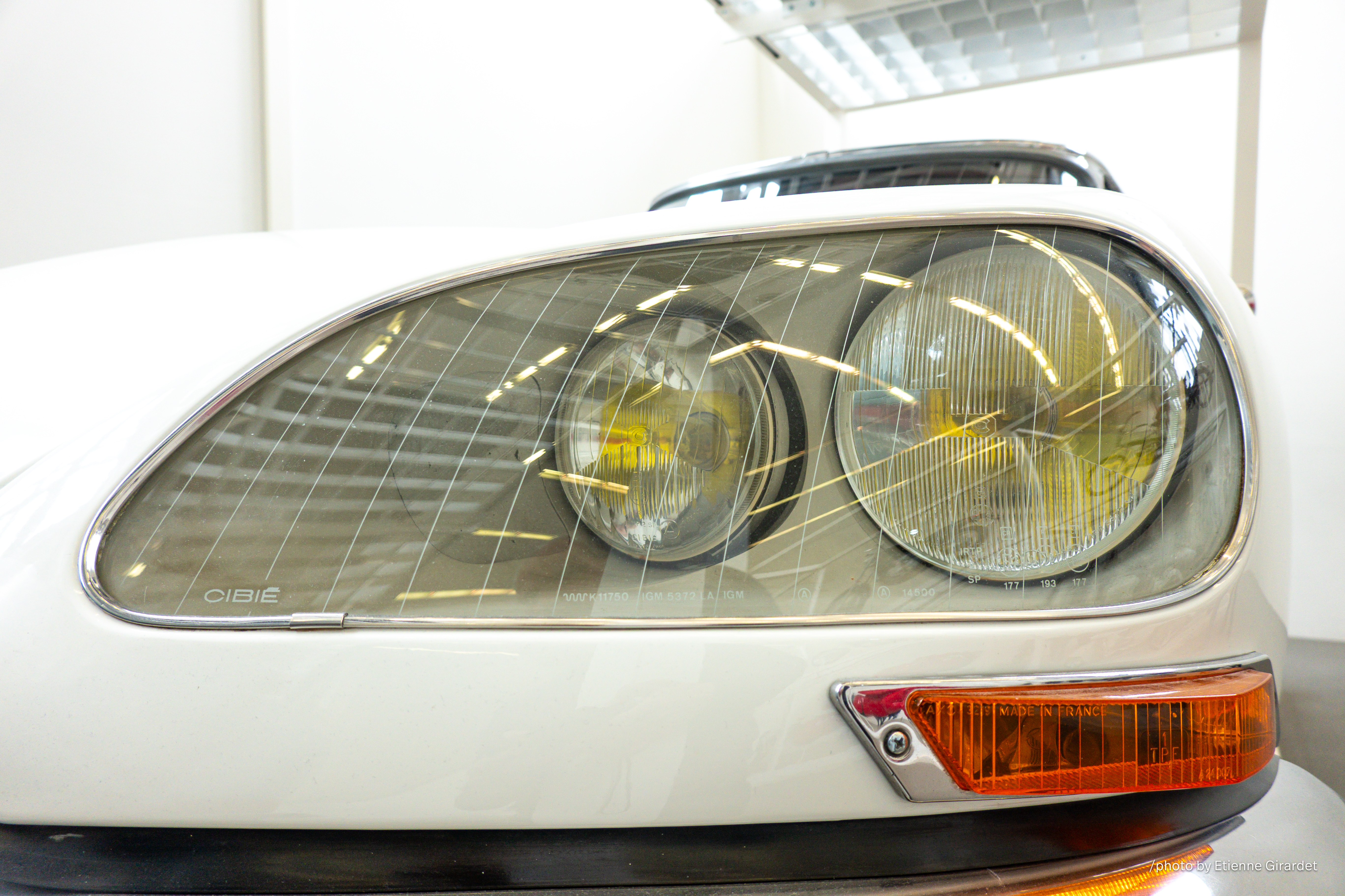 vintage car headlight and details. Close-up of a white car's headlight and front fender section. The headlight is clear glass with a yellow bulb. The car's front fender has chrome trim and an orange turn signal light. The text »CIBIE« is visible on the car's windshield. The image was taken in Munich, Germany. [updated: 02.03.2025 / CC BY-SA]