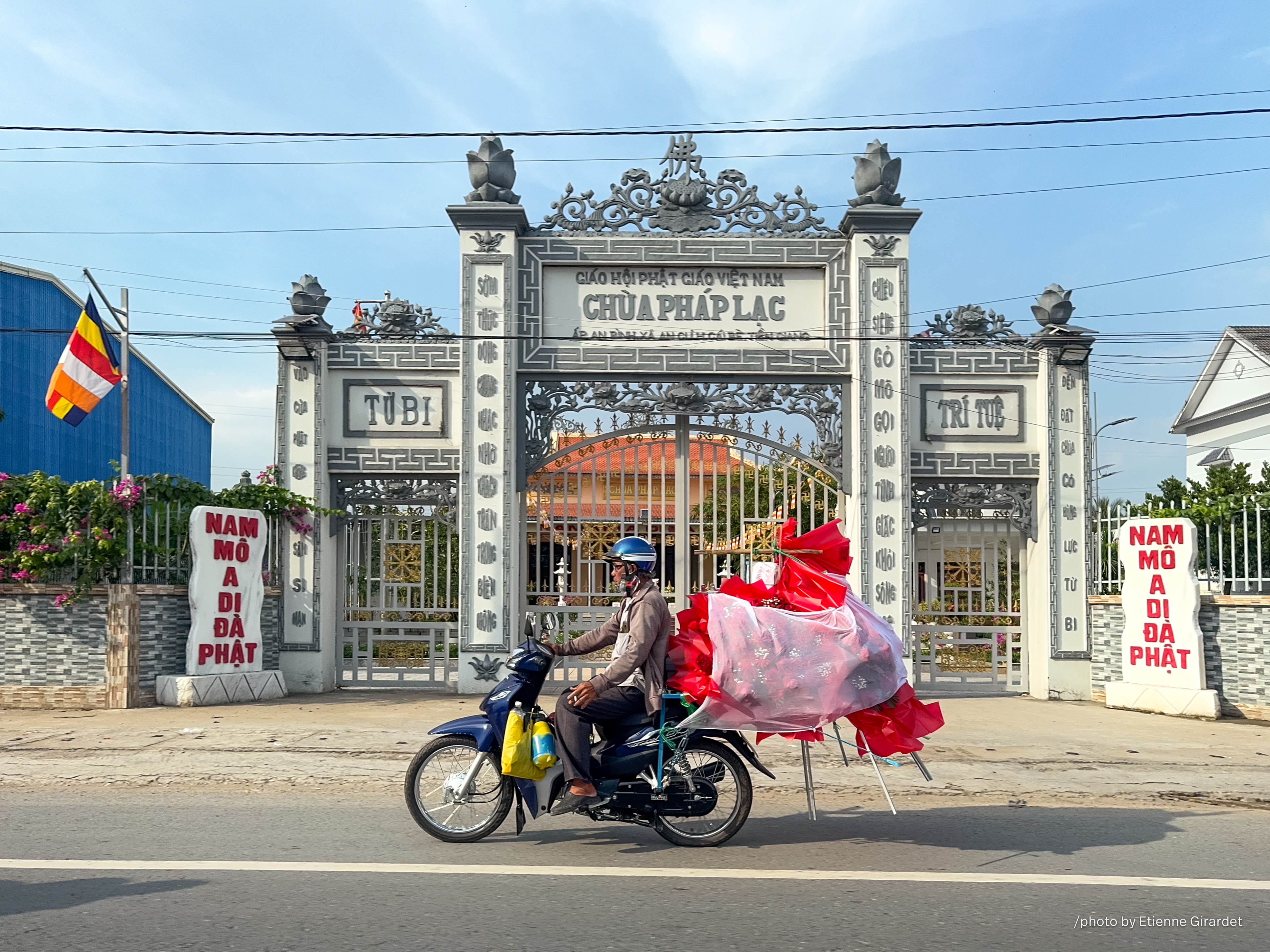 motorbike carrying flowers to temple. A person is riding a motorcycle, carrying a large bundle of red items, likely flowers or decorations, on the back. The motorcycle is on a street in front of a temple gate in Cái Bè, Vietnam. Signs in Vietnamese are visible on the temple gate and on the roadside. »Nam mô a di da phat > In the Infinite Light Buddha I take refuge.« [updated: 17.02.2025 / CC BY-SA]
