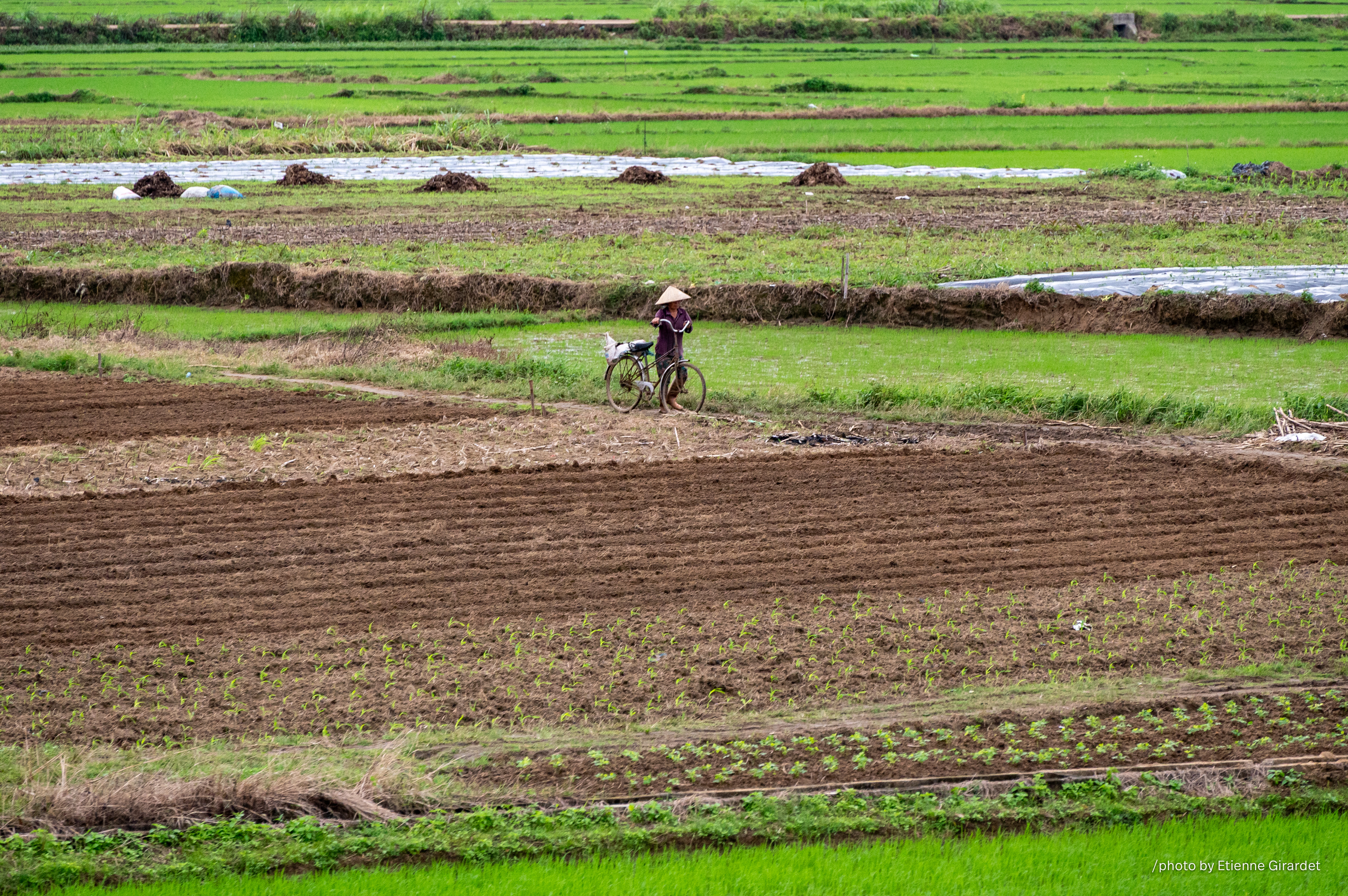 rural farmland with various crops. A person on a bicycle is seen in a rural Vietnamese landscape. Various agricultural plots, including rice paddies and tilled land with emerging crops, are visible. The image suggests agricultural activity in the region. [updated: 17.02.2025 / CC BY-SA]