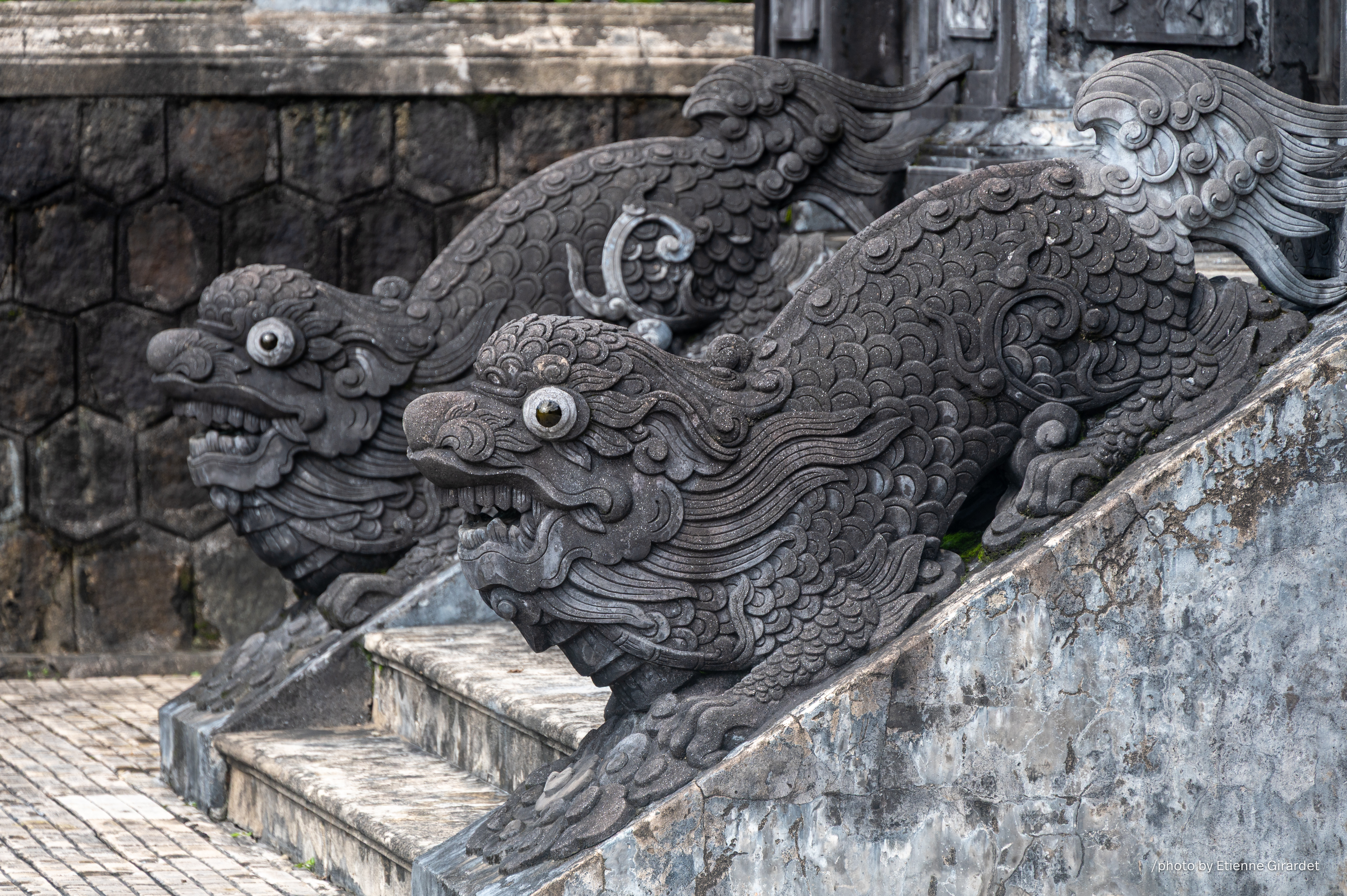 ornate stone dragon statues on steps. Stone carvings of dragons adorn a stone staircase. The carvings are detailed, depicting dragon heads and bodies. The staircase and surrounding stonework are weathered. [updated: 17.02.2025 / CC BY-SA]