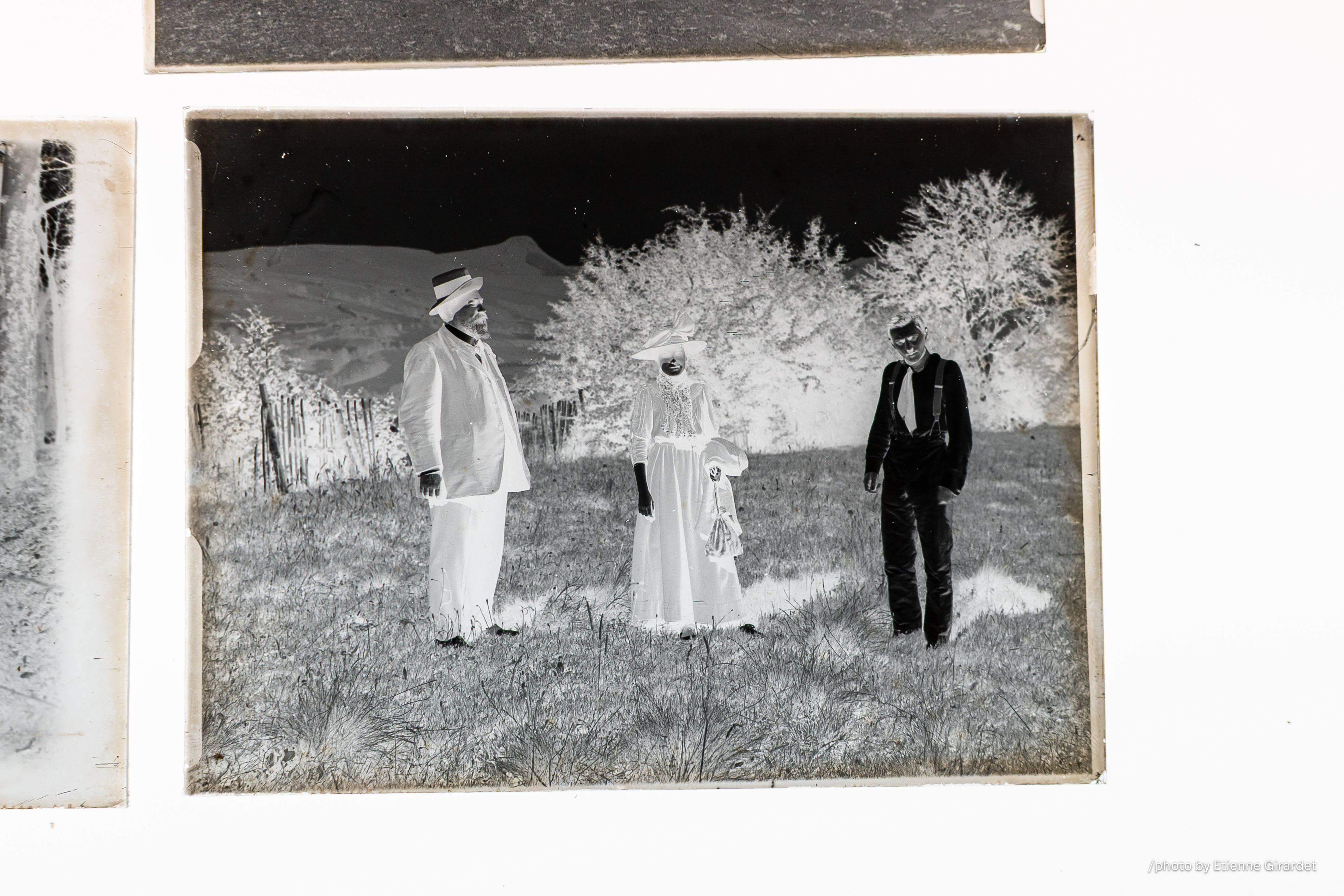 group portrait outdoors in 1900s style. A gelatine dry plate black and white photo negative from the end of the 19th century. Three people are pictured outdoors in a grassy area. They are dressed in formal attire of the era. The setting appears to be a park or similar open space. [updated: 17.02.2025 / CC BY-SA]